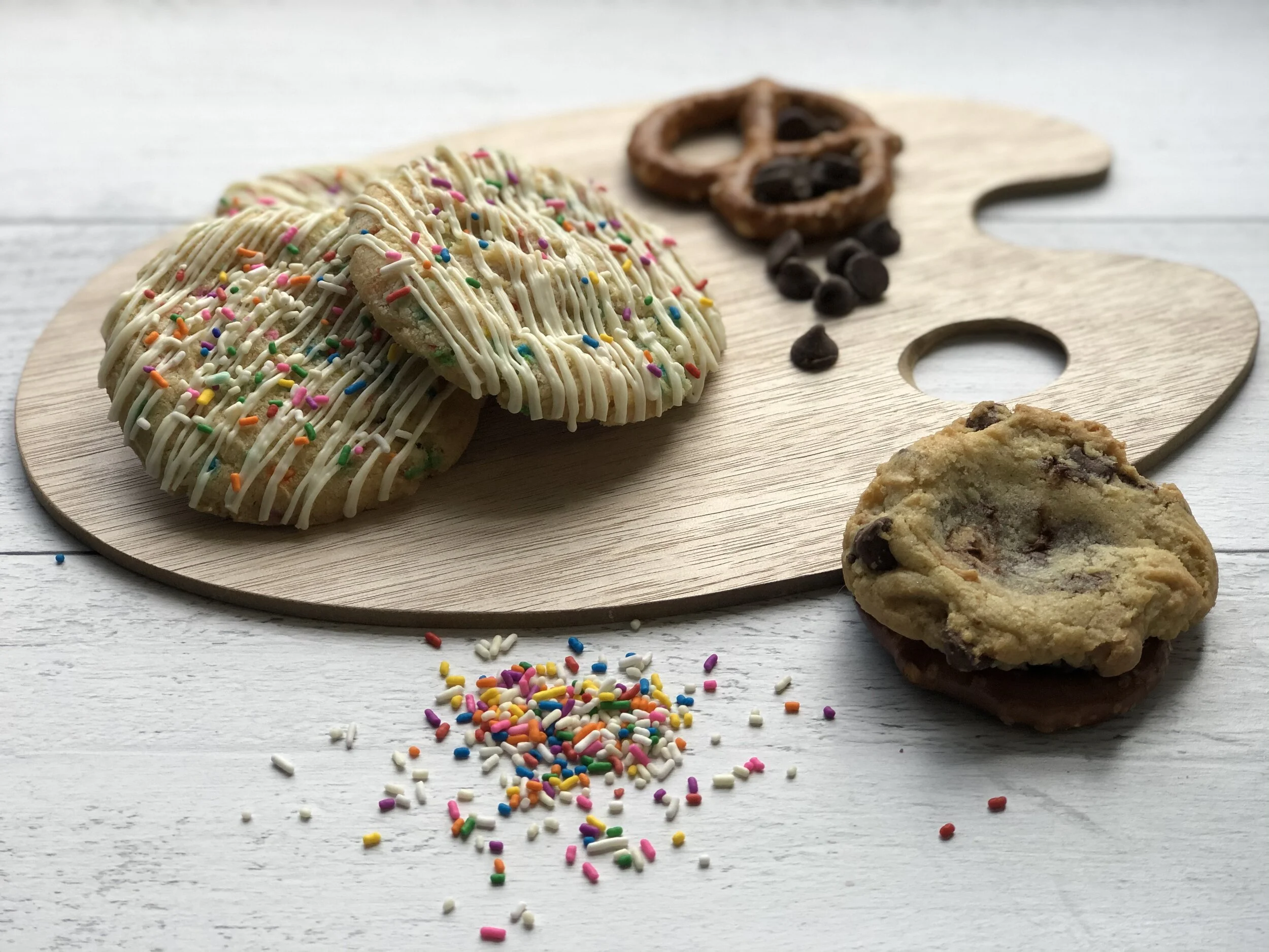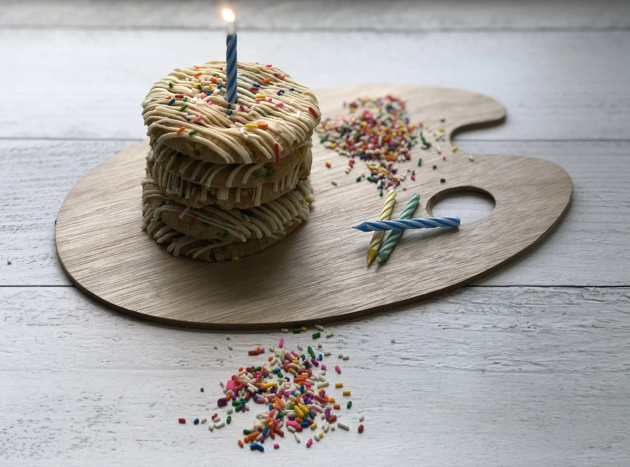 Birthday cake flavored sugar cookie topped with white chocolate drizzle and rainbow sprinkles!